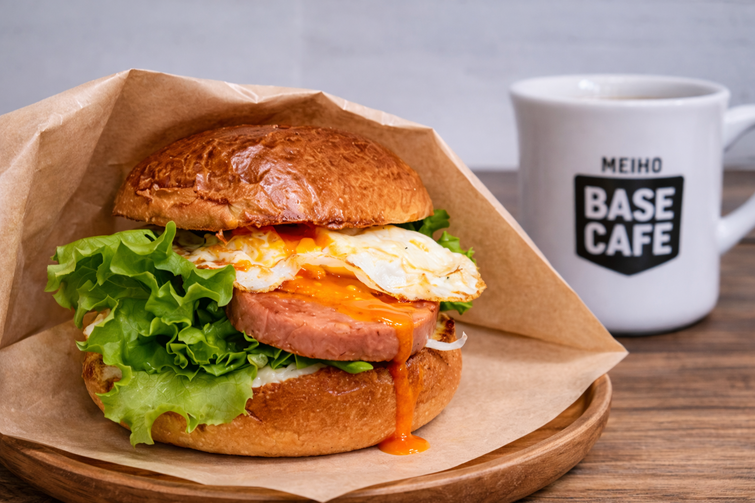 画像は、BASE CAFEのモーニング限定「スパムバーガー」。